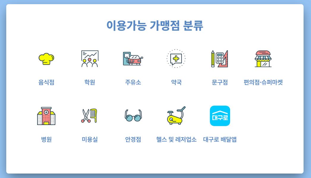대구로페이는 대구 시민의 생활과 가장 밀접한 업종에서 자유롭게 사용할 수 있다는 점이 가장 큰 장점입니다. 전통시장은 물론이고, 동네 소규모 음식점, 카페, 미용실, 학원 등 일상생활에서 자주 찾는 업종 대부분이 사용처에 포함됩니다.