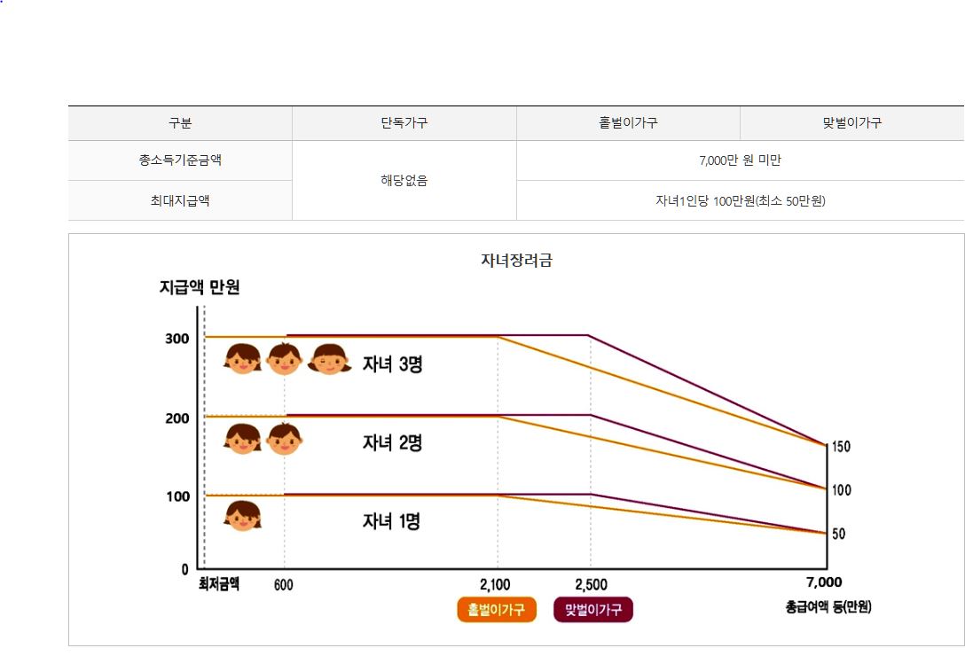 예를 들어 연소득이 2,000만 원인 가구와 4,000만 원인 가구는 같은 자녀 수를 두고 있어도 지급 금액이 다릅니다. 소득이 적을수록 더 많은 지원을 받게 되는 구조입니다.